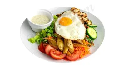 feuilles mixtes de salade, tomates, maïs, lardons, croûtons, pommes de terre, roquette, carottes et oeuf | ||