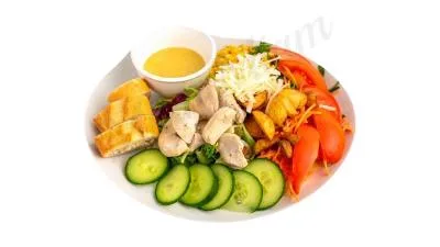 feuilles mixtes de salade, poulet, parmesan, pommes de terre, tomates, maïs, roquette et carottes | ||